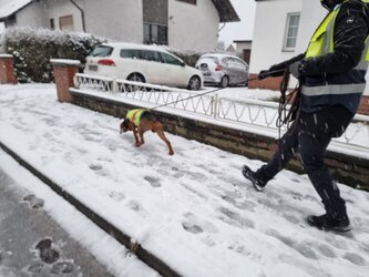 Nachdem wir am Vortag ohne Hunde die Abläufe und Bewegungen besprochen und ausprobiert haben ist es nun an der Zeit das Gelernte, aufgeteilt auf zwei Gruppen, auch mit Hund anzuwenden. Jedes der sechs Team durfte zwei Trails arbeiten. Nach dem ersten Durchgang wurde rekapituliert was schon gut geklappt hat und wo man im zweiten Durchgang noch etwas optimieren möchte. Leider hat uns in diesem Jahr Straßenglätte die Arbeit extrem erschwert, denn Sicherheit für Mensch & Tier muss immer an erster Stelle stehen.